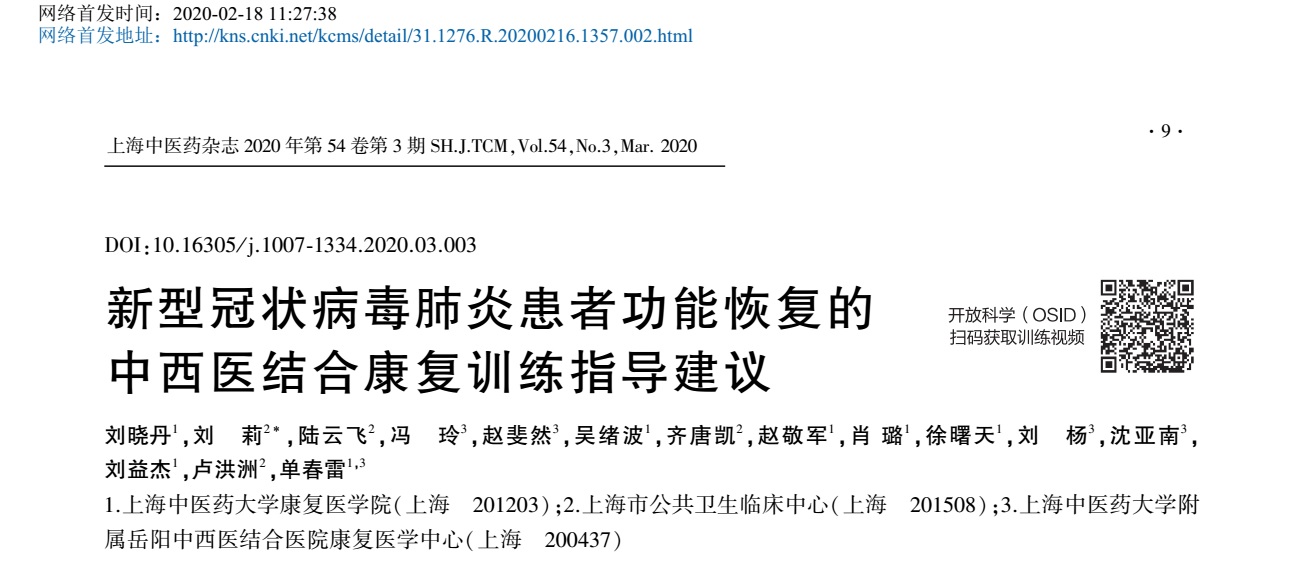对于已确诊的新冠肺炎患者,康复团队争分夺秒完成《新型冠状病毒肺炎患者功能恢复的中西医结合康复训练指导建议》一文,向全国新冠肺炎诊治的一线医务人员推荐团队编制的对于轻型、重型新冠肺炎患者的中西医康复方法,由《上海中医药杂志》收录,2月中旬在“中国知网”首发。其后,武汉方舱医院相关负责人很快与康复团队联系,将运用上述中西医结合康复训练方法促进武汉的新冠肺炎患者功能康复。中华中医药学会、中南大学出版社等机构也提出转载或推广上述新冠肺炎患者中西医结合康复训练方法。